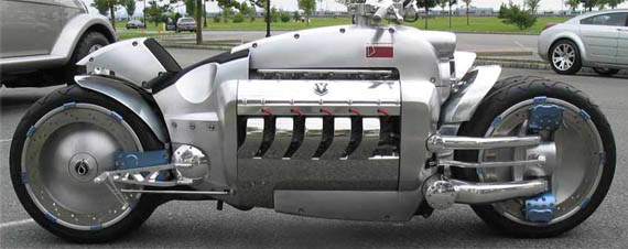 The Dodge Tomahawk Motorcycle may be the only motorcycle listed here that technically isn’t actually a motorcycle. Based on a Viper V-10 bike, it’s got a beefy 500 horsepower engine and 4 wheels. According to the National Highway Traffic and Safety Administration anything with more than 3 wheels on the ground doesn’t qualify as a motorcycle. That probably has something to do with why this beast of a bike never made it into mass production. Shame because this awesome machine is basically just an engine and some wheels that provide raw speed and power between your legs. Source