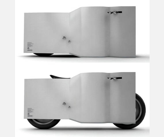 The nUCLEUS takes everything you think you know about motorcycle design and turns it on its side. Truly unlike any other bike design out there NONOBJECT designed this bike to stand on its own in terms of design rather than take inspiration from every other bike concept out there. When not in use the motorcycle looks like a weird box, but when in motion the wheels extend and the saddle rises, showing off its function. Source